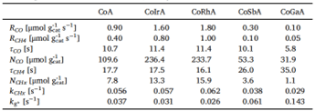 上圖左對CO反應速率和表面濃度以及本征速率常數進行了對比,CO的反應速率與Nco濃度無關,說明CO轉化率與CO和H2兩方面的覆蓋率有關,與NCHx 線性相關,顯示CHx濃度改變CO反應速率。