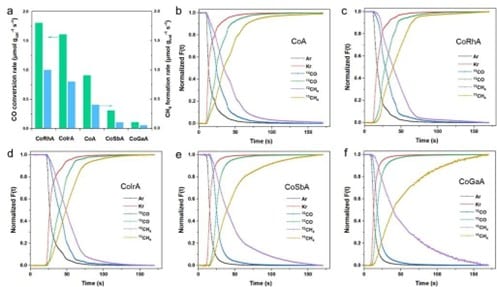 SSITKA 實驗中,將反應氣體由 ¹²CO/H₂/Ar 切換為 ¹³CO/H₂/Ar,監測 CoM/Al₂O₃ 及不同修飾催化劑(CoA、CoRhA、CoIrA、CoSbA、CoGaA)上的 CO 轉化率與 CH₄ 生成速率。圖 (a) 顯示反應穩態下的 CO 轉化與 CH₄ 生成速率;圖 (b)–(f) 為對應催化劑的歸一化瞬變曲線,用以評估中間物種的停留時間與表面行為,相關參數整理如表所示。