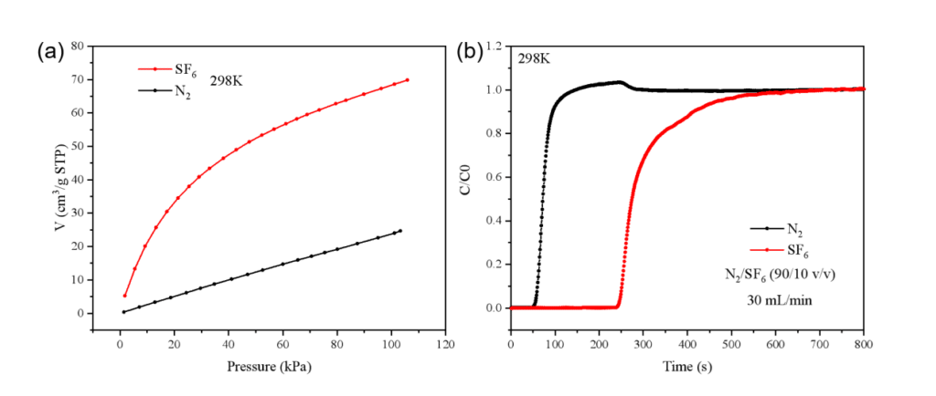 (a) MOF-1在298K下對SF6和N2的吸附等溫線;(b) MOF-1在溫度為298K,總壓為2bar,總流量為30 mL/min(He/N2/SF6=50/45/5)條件下的競爭吸附穿透曲線