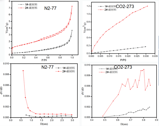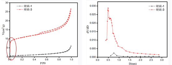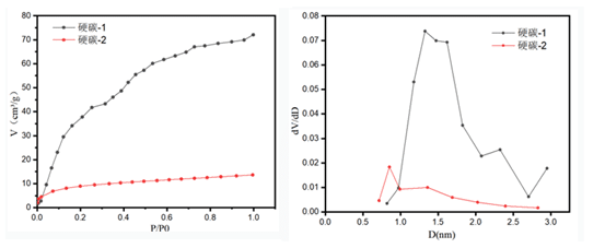 還可以通過CO2氣體的吸附同樣可以得到關於硬炭材料的比表面積和孔容的分析。如圖6所展示為某大學課題組製備的兩種硬炭材料,結果表明,使用CO2作為吸附分子探針測試的硬炭-1比表面積達到了137.1m2/g,微孔孔徑在1.368nm左右,孔容更是達到了0.113cm³/g,遠遠超過硬炭-2的比表面積和孔容。