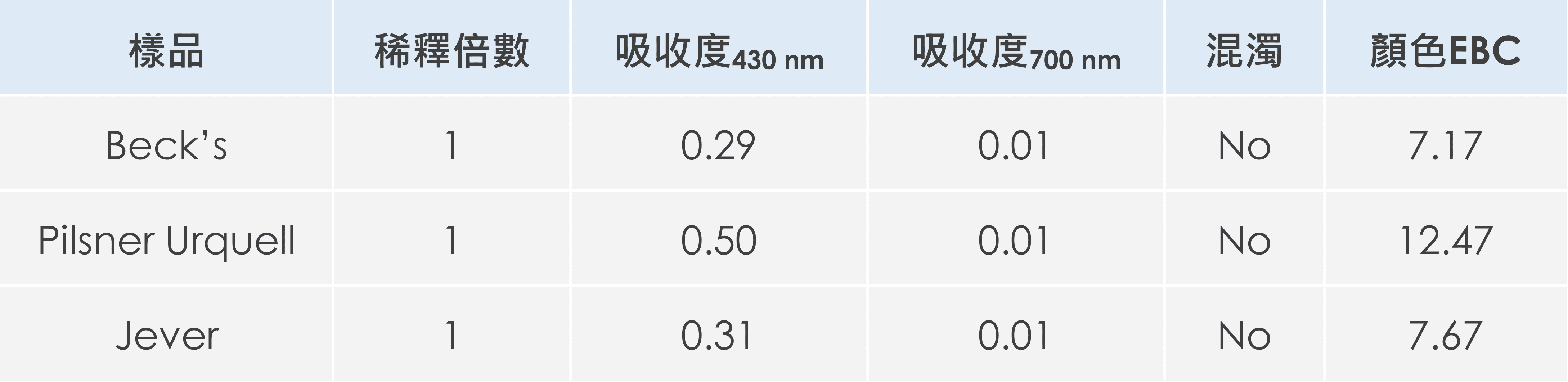 以三款市售啤酒進行分析顏色和濁度分析:Beck’s、Pilsner Urquell和Jever,蒸餾水作為參考用。