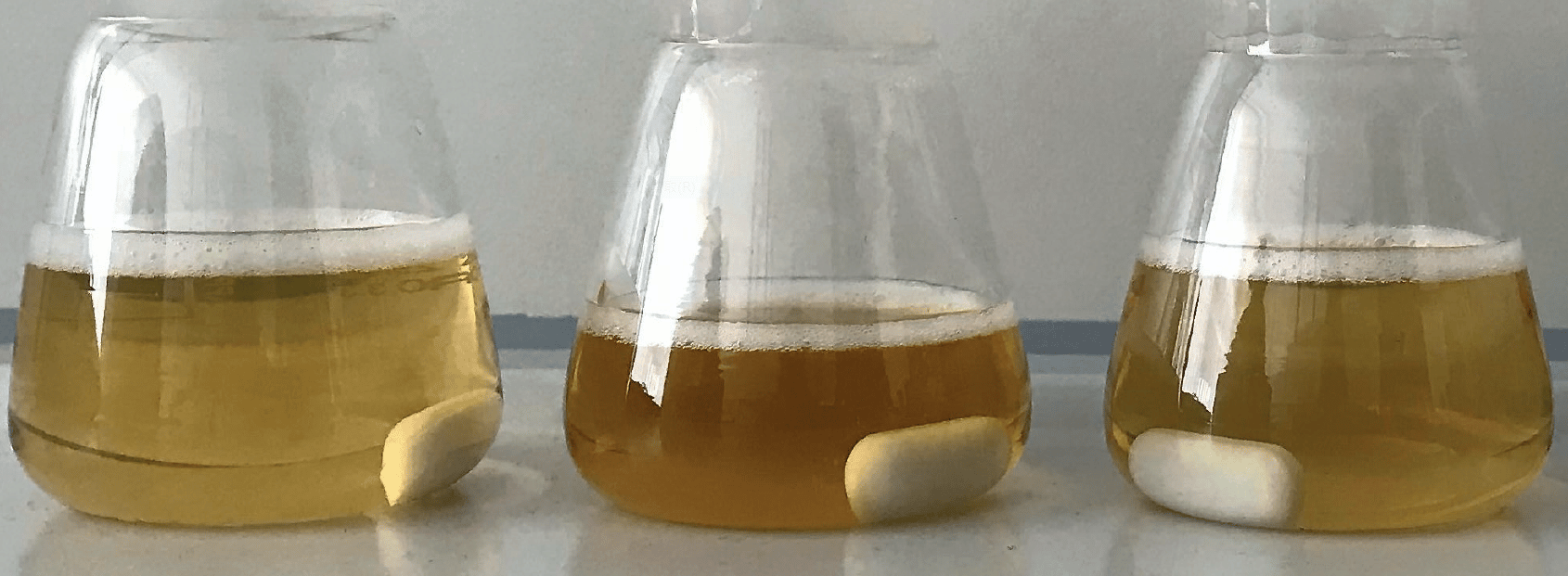 打開啤酒並倒入較小的容器中,使其通風約1小時,在此期間攪拌和搖晃以促進二氧化碳逸散和泡沫消失(Fig. 1)