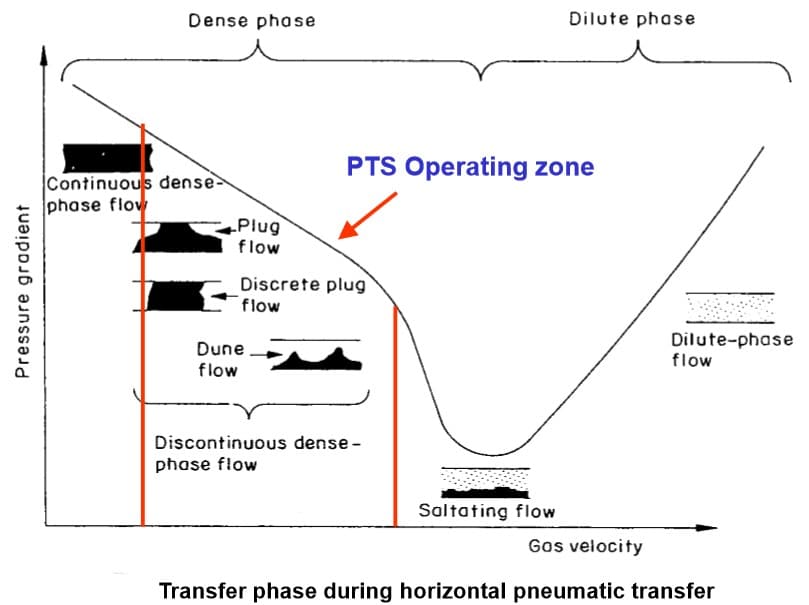 下圖,PTS的工作範圍以高密度方式傳送物料,粉體填充管線傳輸。 反觀,真空泵進料方式,管線充斥空氣,使得粉體以較疏鬆方式傳遞。 |