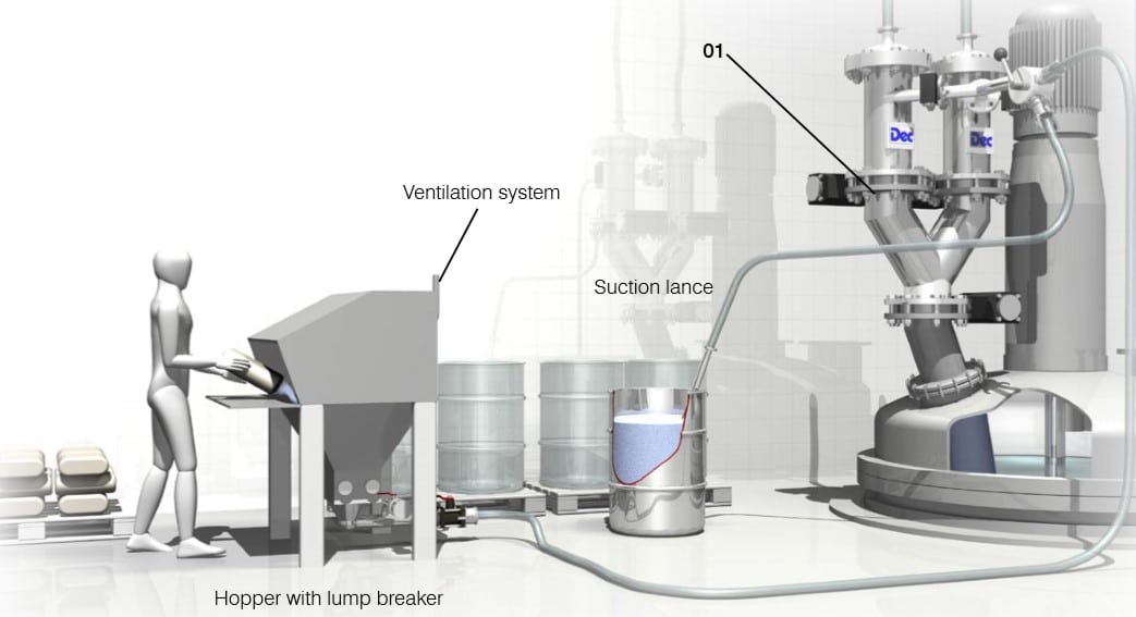 首先,在25kg小袋投料,我們設計了接地的抽氣投料系統,減少人員在投料過程吸入粉塵。在hopper上,裝設了破塊系統(de-lumper),改善結塊問題。此外,密閉式的桶裝物料抽取系統,藉由PTS抽取物料,降低人員接觸有毒溶劑。