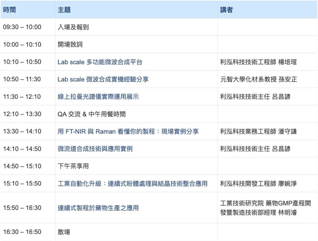 這次特別邀請 元智大學化材系孫安正教授 與 工研院藥物GMP製程開發技術部林明濬經理,分別分享學界在合成實驗上的應用經驗,以及連續製程技術在產業端的實務導入。