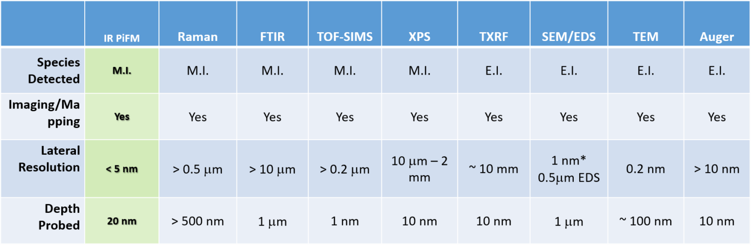 因為工作原理都會用到雷射,所以時常會將PiFM與PTIR搞混,實際上PiFM可以提供更細的空間解析度(Spatial Resolution,更強的靈敏度以及更多的量測靈活性,特別是PiFM採非接觸式的方式,反之,PTIR需要以接觸式的方式才能取得較好的量測結果。
